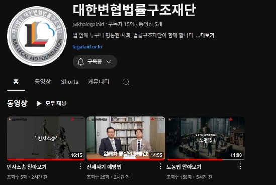 재단은 2023년도에 ‘사랑의 열매-경기사회복지공동모금회(지산그룹 지정후원금)’로부터 법률구조와 법률교육을 위하여 후원을 받았으며 업무협약에 따라 법률교육 사업의 일환으로 법무법인 지율 소속의 우원상, 한수왕 변호사와 함께 자립준비청년 뿐만 아니라 청년들이 일상에서 겪을 수 있는 법적인 문제 중 노동법(근로관계), 부동산(전월세 계약), 민사소송(금전소비대차) 3가지 주제에 대한 법률교육 동영상을 제작하였고, 많은 사람들에게 공유하기위해 유튜브 채널을 개설하여 유튜브 및 청년재단 등 유관기관에 교육자료로 배포할 예정임. ★유튜브 채널 링크★ : https://www.youtube.com/@kbalegalaid